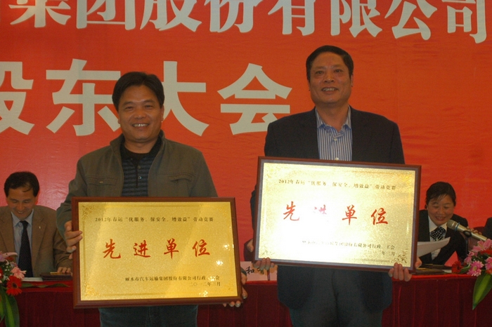 會上集團公司舉行表彰儀式,表彰獎勵2012年度先進單位(2個)、先進分工會(1個)、先進班組(19個)、優秀員工(27人)、工會積極分子(26人)、新增安全駕駛超150萬公里(17人)、新增安全駕駛超100萬(7人)、2012年春運勞動競賽先進單位(2個)、春運先進班組(12個)和春運先進個人(30人)。