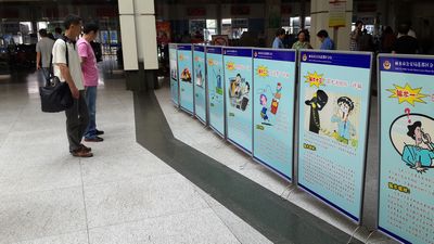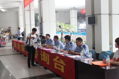 活動現場懸掛了安全生產宣傳標語,設置了安全咨詢臺,并在候車室前廳、中廳等人員聚集的位置,放置了各類以安全為主題的宣傳版畫,圖文并茂的向旅客宣傳了防詐騙、交通、防恐等安全知識。在整個活動期間,到咨詢臺來現場咨詢的旅客絡繹不絕,各單位咨詢人員還向旅客發放了《平安交通  人人有責》、《警民相約  共建和諧》、《公民防范恐怖襲擊手冊》、《為防范與遏制“電信(網絡)詐騙犯罪”致市民的一封信》等十余種安全生產宣傳資料共計2000余份,營造了安全生產月活動的良好氛圍。
