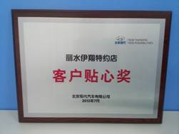 近年來,伊翔公司在主抓生產的同時,講實效、重管理,不斷完善企業(yè)內部管理制度,服務質量日趨提升。日前,從北京現(xiàn)代公司總部傳來喜訊:麗水市伊翔汽車銷售服務有限公司榮獲北京現(xiàn)代汽車有限公司頒發(fā)的“客戶貼心獎”和“M/S進步獎”,王明敬獲北京現(xiàn)代2012年度“優(yōu)秀銷售顧問”稱號。
