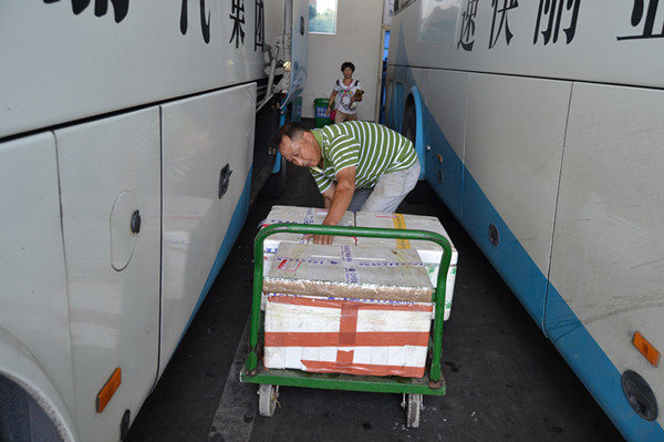 說話間,一輛班車緩緩駛入車站。在下客區等候的江永貴和同班的胡瑞華快速地打開車輛行李倉。“一件、兩件、三件、四件……”江永貴一邊念著數字一邊熟練地搬著貨物,一件件貨物在他們手上快速頻繁地拿起、放下。雖然揮汗如雨,但規范操作程序卻絲毫不受影響:仔細核對貨號、件數、 到達站點、駕駛員簽名…… ,對精密電子設備、易碎物品、海鮮等 ,他們總是不忘給予特殊的“關照”。這看似簡單機械,沒有技術含量的工作,卻需要莫大的毅力和耐心。車艙狹小,為適應卸貨碼貨的需要,他們不停的變換姿勢,時而曲膝半蹲,時而探身彎腰,片刻,他們剛剛有點晾干的工作服又一次被汗水浸透了。