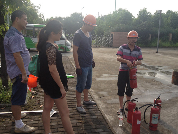演練科目三:安全稽查科科長溫麗軍對如何使用提式干粉滅火器的講解和現場演示,參演人員對滅火器的使用進行實際操作。