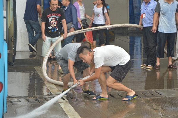 東站的站場(chǎng)上,到處是兄弟單位救援人員的身影。有的參與到電力搶修、有的維護(hù)秩序、有的引乘導(dǎo)乘,大部分人參與到清掃站場(chǎng)中:前面人員拉起消防帶、把好水槍,沖到哪片淤泥,后面人員就掄起掃把跟到哪,快速把污泥、污水沖掃到陰溝里,配合得恰當(dāng)好處。烈日下,個(gè)個(gè)揮汗如雨,濕透了衣服,有的赤著腳,有的索性光著膀子。水槍沖到哪,掃到哪,身后留下一片片潔凈的場(chǎng)地。
