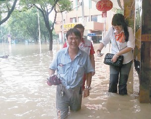 洪水突襲市區后,售后接待電話就接連不斷,傳來的都是客戶急切救援的聲音。為更快速的開展救援工作,20日下午,夏偉強經理親自帶領施救組在一線實地指揮搶險救災;經理助理金虹則帶領銷售團隊分組分頭沿著水路挨家挨戶上門咨詢、了解車輛受災情況,以便施救車輛更快的實施施救工作;經理助理呂佩軍在現場與售后師傅們現場轉移車輛,推、拉、移所有的招式都用上了。渾濁的污水都沒過了大腿,他們都無所畏忌。