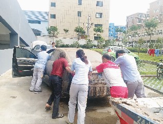 8月21日凌晨5點,公司微信事故群就滴滴的開始叫喚,這時候水東片區的水位已經基本恢復原位,馬路上堆滿了水位退去的生活垃圾、沼泥,空氣中彌漫著災后的油臭味。他們又開始了忙碌的一天,今天的任務是先將客戶車輛安全的轉移到可轉移點,男生們負責體力活,推車拉車,銷售部的女生們負責守點看車,聯系客戶。