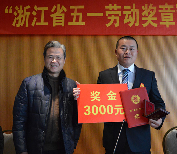 之后,市總工會黨組書記、常務副主席陳子民為章雙林頒發“浙江省五一勞動獎章”、證書和3000元獎金,并親自為章雙林佩戴了獎章。