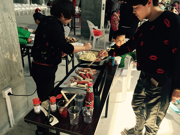 包水餃日常在家我們也經常做,可是自己揉面搟餃子皮對于很多人來說還是第一次。還好我們組有幾個經驗的姐姐,在她們的指導下大家分工合做,有的揉面有的搟餃子皮有的負責包。由于我們當中還有很多是初學者,搟出來的餃子皮大小厚度各有不同,包的餃子更是融入了南北方不同手法,最后包出來的餃子形狀各異,色彩斑斕。但是自己的勞動成果味道總是特別的好。這邊包餃子的同事們正包的起勁,那邊燒烤的同事也沒閑著不停為我們送上他們烤的烤串品嘗。燒烤的時候也是小插曲不斷,由于功率過大先是把同事家里帶來的插座燒了,后來又跳閘沒電,所幸都一一解決了,我們才能吃上色香味俱全的燒串。