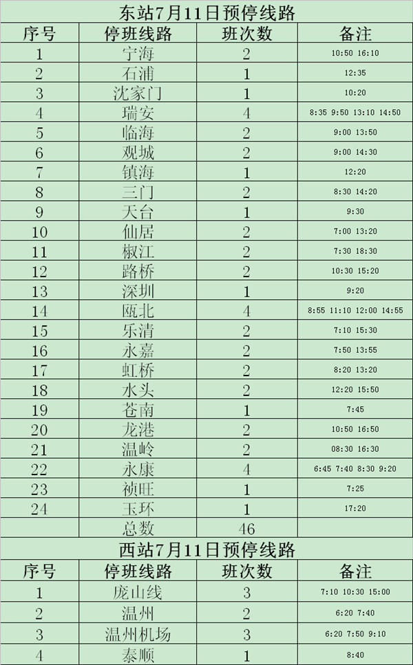 因臺風“燦鴻”影響,為確保乘客安全,麗汽集團客運東、西兩站暫時停開下列班車,具體復班時間視11日臺風情況再行公告。