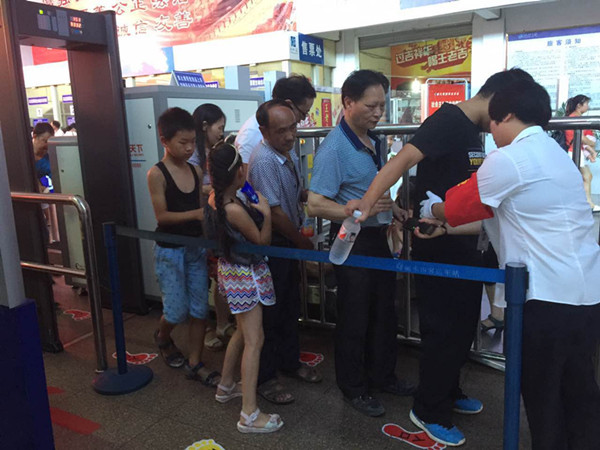 活動第一天,佩戴志愿者紅袖章的同志已經穿梭在車站的各個角落,熱情的為來往旅客服務。在售票大廳,為旅客介紹客車的運行班次,引導幫助旅客使用自助售票機購票;在服務總臺,為未帶身份證的旅客辦理信息登記工作;在安檢口,積極督導旅客進行人物分離安檢,維持排隊秩序;在候車大廳,為旅客提供免費防暑涼茶,宣傳客車服務;在長途班車檢票口,幫助不熟悉實名檢票的旅客順利檢票通過。