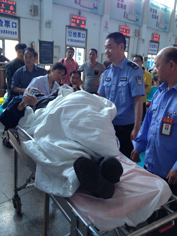 5月8日下午16:00左右,東站保潔員吳麗君在打掃候車室的男廁所衛(wèi)生時(shí),發(fā)現(xiàn)一位80多歲、老人身著病號(hào)褲的老人家呼吸困難、面色暗黃地倒在廁所內(nèi)。吳麗君急忙上前詢問,老人目光無神,神志不清,已經(jīng)說不出話了。