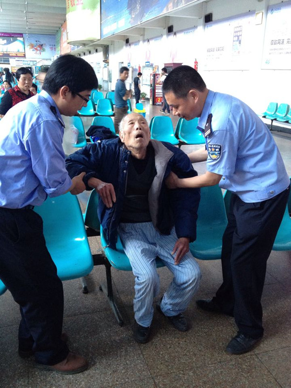見此情況,吳麗君立即通知了駐站派出所。檢票員施筆婷經(jīng)過此處,得知情況后急忙向當(dāng)班值班站長匯報(bào),一邊撥打了120。聞?dòng)嵹s來的派出所民警張冰等人將老人扶出衛(wèi)生間。隨后120趕到,東站工作人員協(xié)助120將老人抬上救護(hù)車,送往麗水中醫(yī)院救治。為能盡快聯(lián)系上老人的家人,民警檢查了老人的隨身物品,可是沒找到任何有用的信息。目前,有關(guān)方面正積極努力通過其他途徑查找老人的親屬。